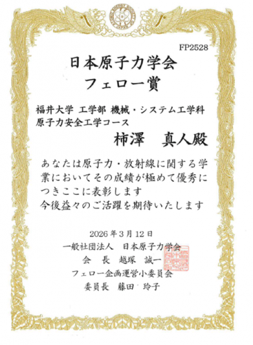■受 賞 者:柿澤真人(機械・システム工学科 原子力安全工学コース4年)