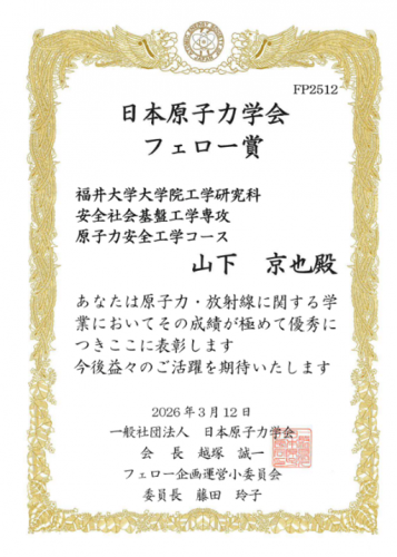 ■受 賞 者:山下京也(工学研究科 安全社会基盤工学専攻 原子力安全工学コース2年)
