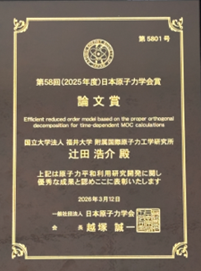 辻田講師(附属国際原子力工学研究所)が日本原子力学会にて第58回日本原子力学会賞論文賞を受賞しました 2026/03/22 ■受 賞 者: 辻田浩介(附属国際原子力工学研究所)■論 文 名:Efficient reduced order model based on the proper orthogonal decomposition for time…… 詳細はこちら